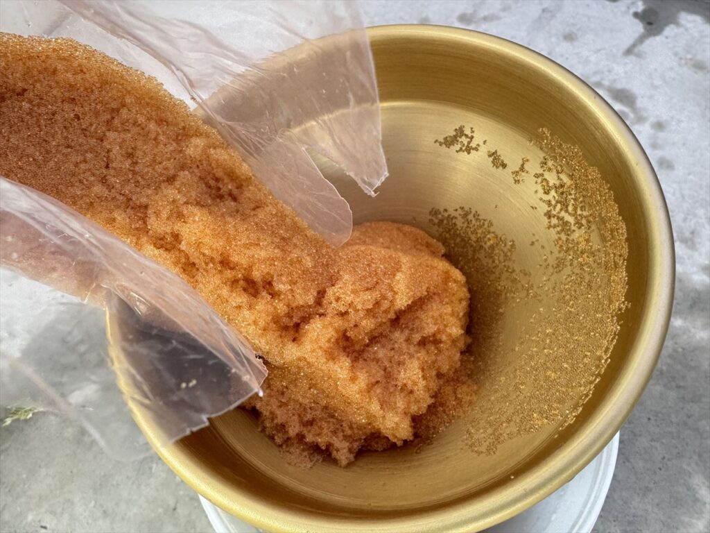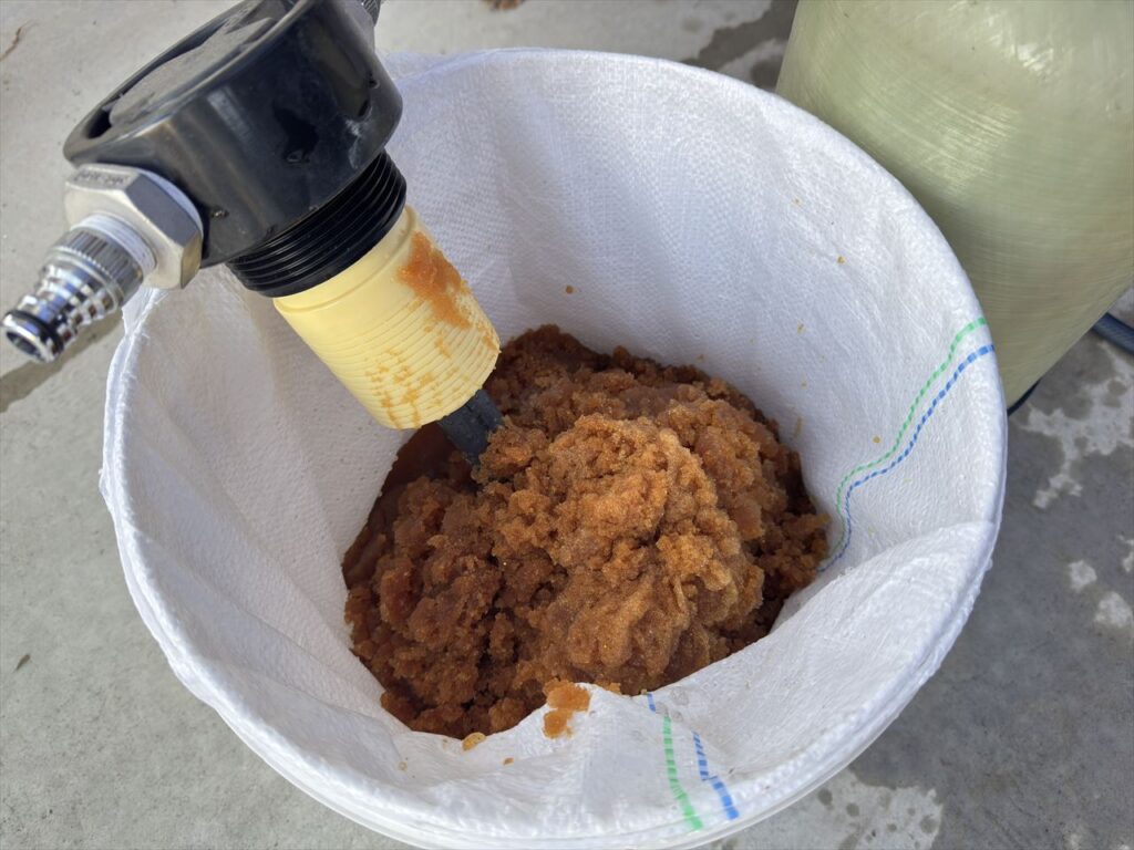 古いイオン交換樹脂は18Lタイプのバケツに土のう袋をかぶせ、そこに移していくとその後の処分がしやすいでしょう。また、タンクにイオン交換樹脂が残る場合はこまめに水を入れながらするときれいに取り除けます。