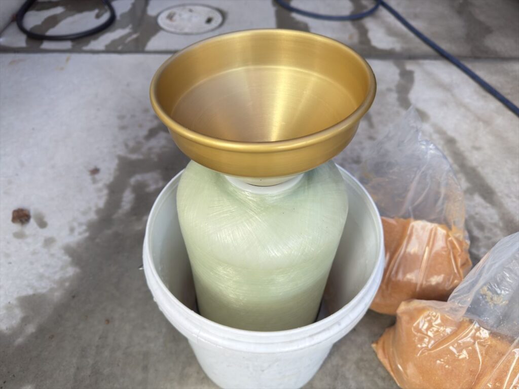 タンクがきれいになったら下の画像のようにして新しいイオン交換樹脂を装填します。
