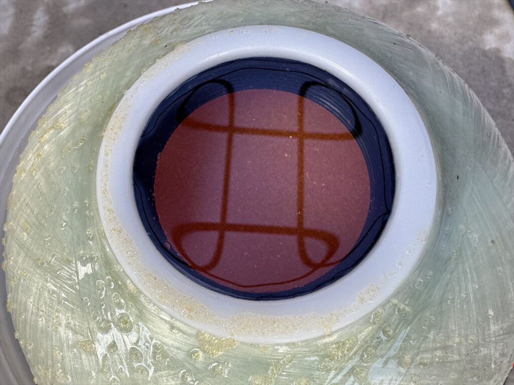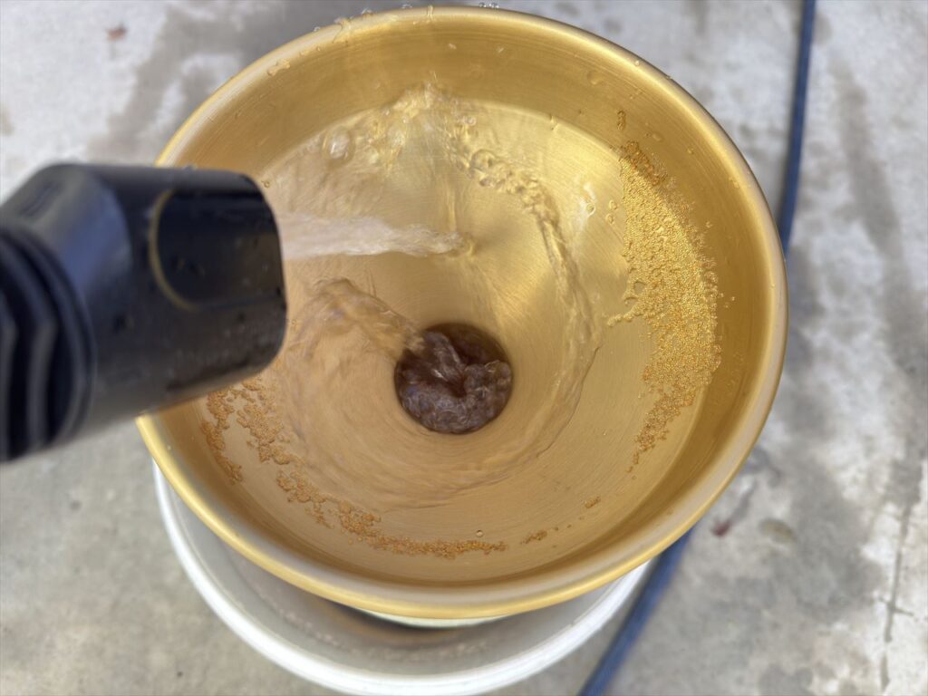 バケツのなかにタンクを入れて作業すると万が一イオン交換樹脂をこぼしてもリカバリーすることができます
