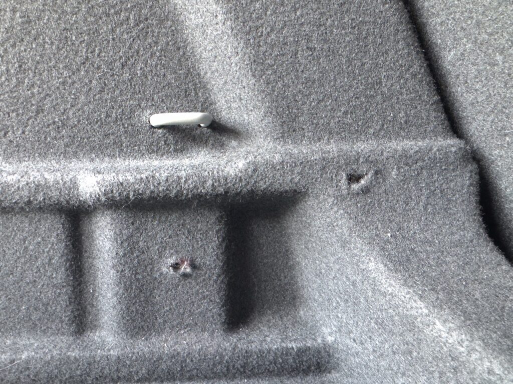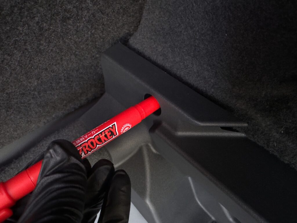 マーキングしたところを中心にカッターナイフを使ってフェルト生地に穴をあけるとその奥からブラケットを固定するためのネジ穴が顔を現しました。