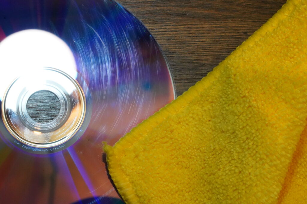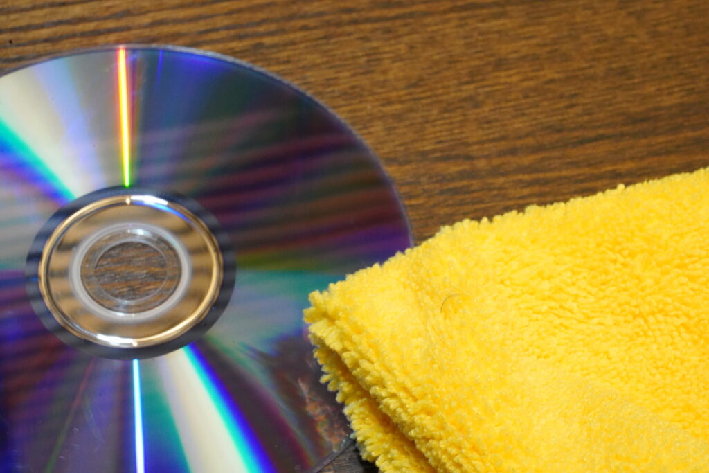 ちょっとした実証実験をしてみました。準備したのはコストコブランドのマイクロファイバークロスとDVD。DVDの読み取り面を耳ありクロスと耳なしクロスで擦ってみます。