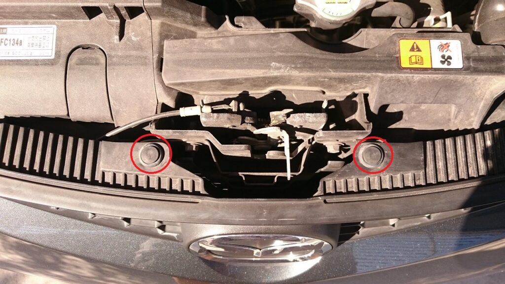 まずは上部、赤丸で示すボルトやクリップを外します。