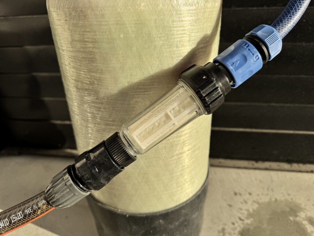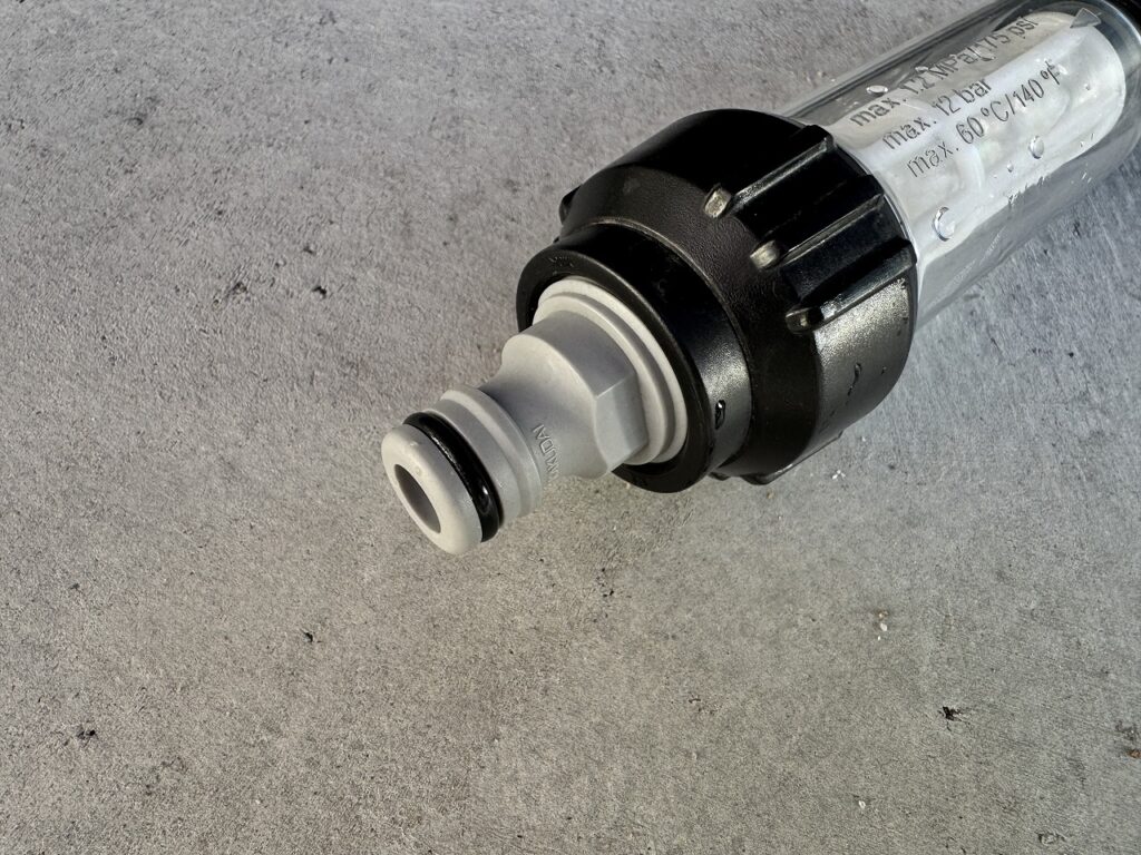 純水器OUT側付近の適当な箇所で散水ホースをカットしそれぞれにコネクタを取り付けます。あとはフィルターの向きに気を付けてホースと接続できれば完成。