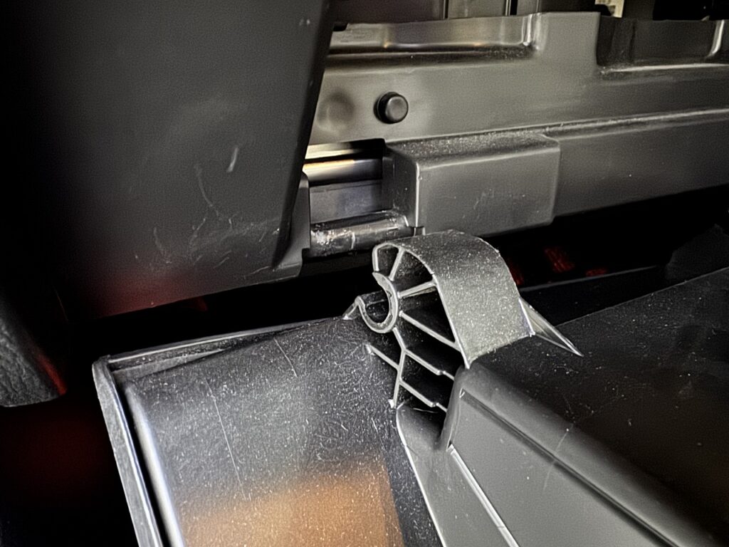 外し方はとっても簡単、工具も一切必要なし。トレイの両サイドを内側に力を入れてたわませながら手前に引っ張るとストッパーが外れます。