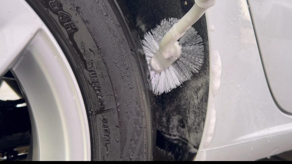 タイヤブラシを使ってサイド面を擦りながら洗浄します。