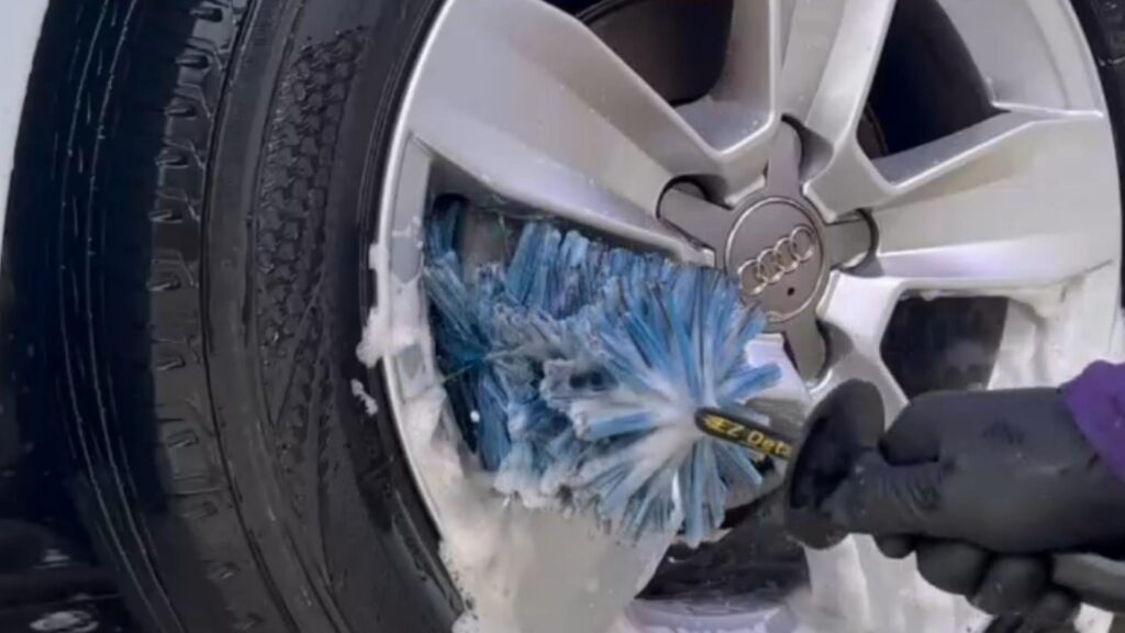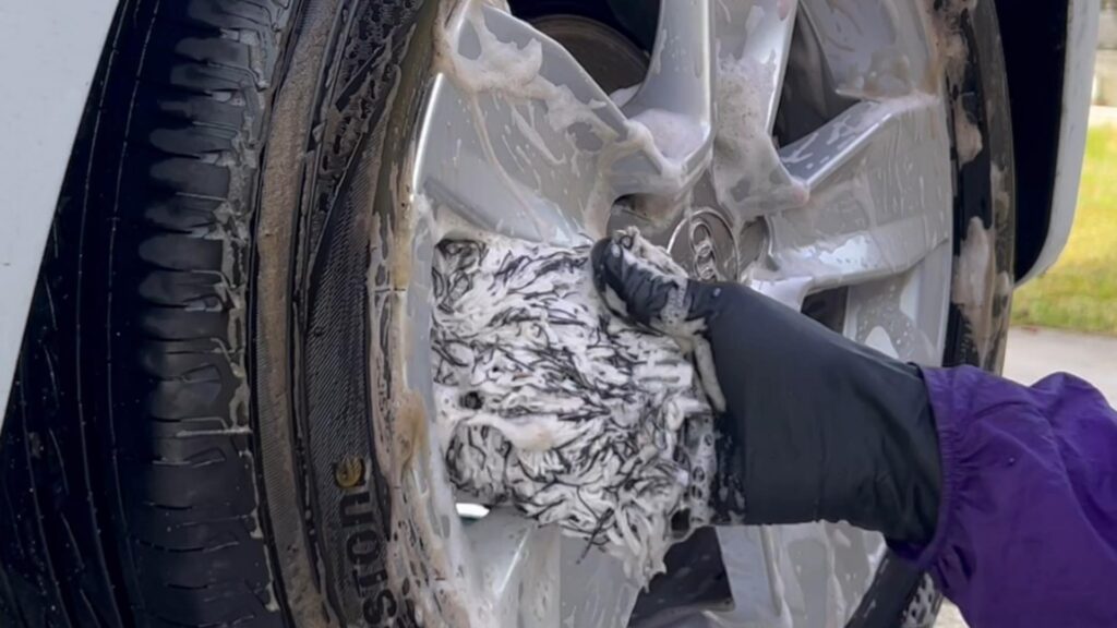 インナーリムはホイールブラシやウォッシュミットを使って、スポークや手の入らない隙間はディテイリングブラシを使って洗います。